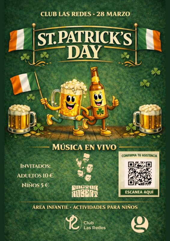🎉 ¡Celebramos St. Patrick’s Day en Club Las Redes! 🎉🍀 El próximo 28 de marzo ven a disfrutar de un día lleno de ambiente irlandés en el club. 🍻 Cervezas de importación ☘️ Puestos gastronómicos 🎶 Música en directo con el grupo Doctor Robert 🕺🏻Fiesta y Dj Los más pequeños también podrán disfrutar de una tarde especial a partir de las 16:00h con: ✨ Gymkana “Búsqueda de la olla de oro” 🎨 Taller